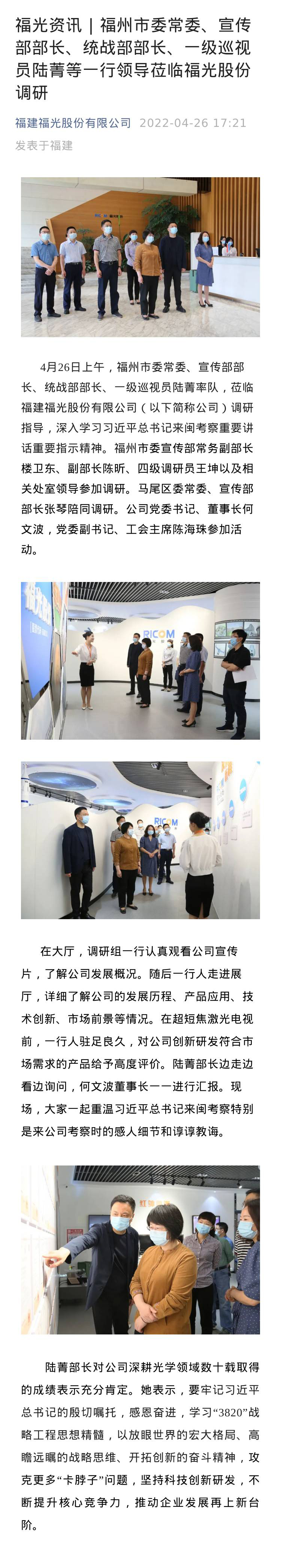 當前位置:新聞中心->福州市委常委、宣傳部部長、統戰部部長、一級巡視員陸菁等一行領導蒞臨福光股份調研